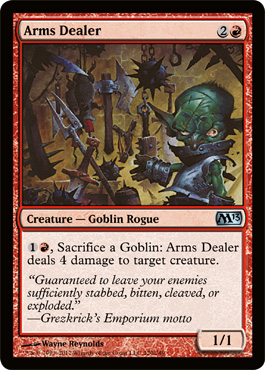 For those of you who are not aware, Arms Dealer is actually a reprint from Mercadian Masques. Weird huh? At the time, there were very few goblins to even use his ability with. In M13 draft, you should have no problem picking some up. A lot of my draft decks with him have had about 8-10 goblins or goblin token producers.