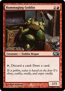 Generate enough tokens and give this little guy some value as you sac them to retrieve lost artifacts. You can even have a draw-discard-regrowth engine going with Rummaging Goblin.