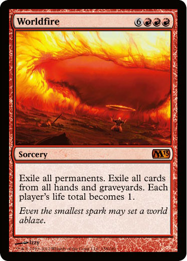 There’s also the small fact that it doesn’t have to be YOUR Oblivion Ring. Say you have a Chandra or whatever that you know your opponent is going to Oblivion Ring, try it out. The game might go long and this might be the ‘I win’ card. Everything will go bye bye, including the Oblivion Ring, thus bringing back your creature or planeswalker to win you the game on the following turn.