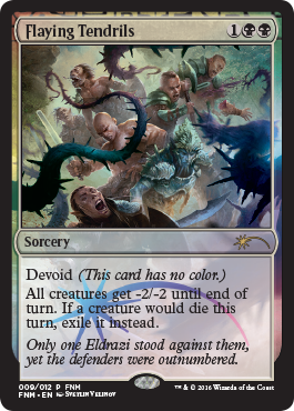September’s FNM promo is actually quite nice, but mainly something you’ll see in sideboards. It’s very good against any deck that tries to abuse of ‘dies’ triggers or just tries to swarm you with a weenie horde (I’m looking at you monowhite humans). Also, is that Zulaport Cutthroat getting flayed? Hmm…maybe or maybe not? that weird almost circular sword is similar.