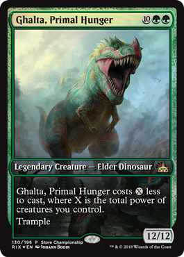 And, finally, the part you all actually came here to see, is the full-art card from Rivals of Ixalan you can receive just for participating—and it’s a freakin’ Elder Dinosaur. World, meet Ghalta, Primal Hunger.
