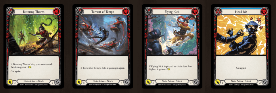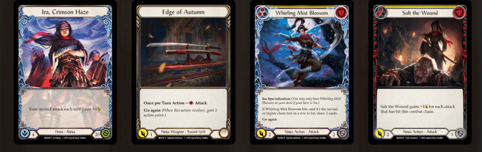 Flesh and Blood is set in the fantasy world of Rathe, where players equip various hero cards with weapons and armor to do battle against each other. The first Flesh and Blood set, Welcome to Rathe, includes four heroes to start: Dorinthea Ironsong (Warrior), Bravo, Showstopper (Guardian), Rhinar, Reckless Rampage, and Katsu, the Wanderer (Ninja). The game features a unique resource system that allows players to play out their full hands on each turn, and gameplay that rewards player skill over luck of the draw.