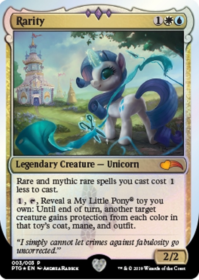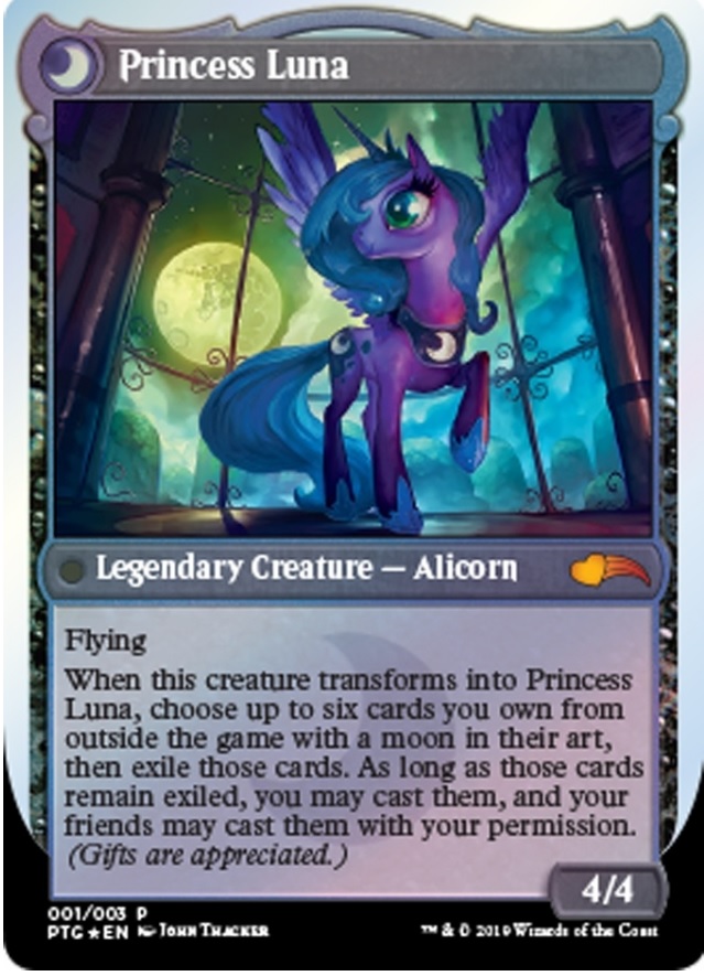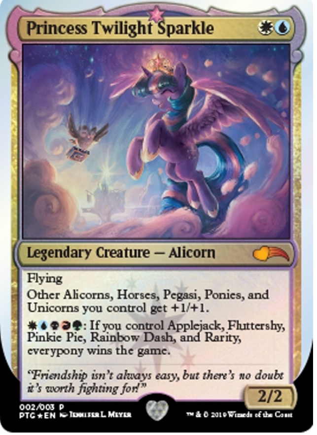 In addition to supporting a charitable cause, the cards included in the set will more than likely become instant Commander staples, retain value on the secondary market, and inspire single sales of long-forgotten rares that synergize with the Ponies. The Princess Twilight Sparkle card is a fantastic choice as a Commander for a Horse-themed deck, and will likely create a single sales uptick in cards that summon pegasi, horses, alicorns, and unicorns. Rarity and Nightmare Moon/Princess Luna are simply an overall good multiplayer cards with great flavor mechanics. Make no mistake, these Ponies will be in demand.