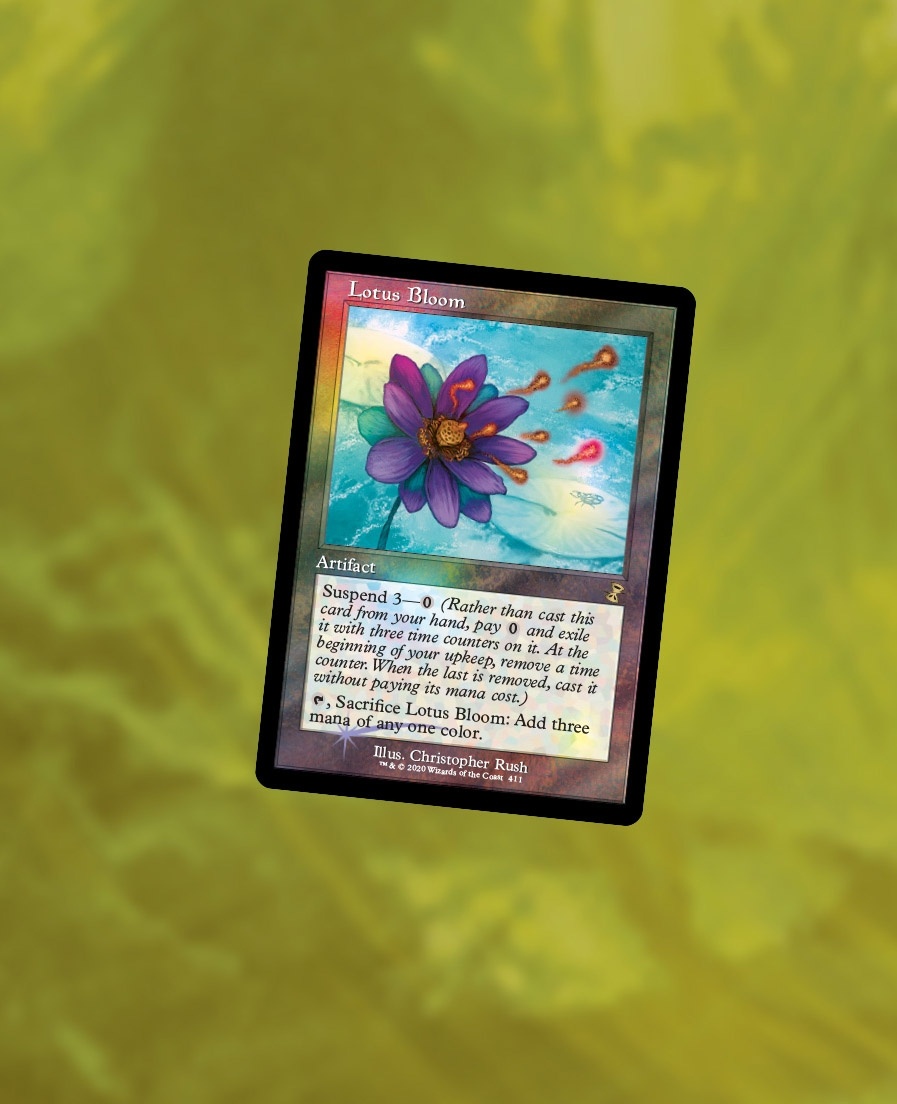 On January 1, WotC dropped a preview card for their upcoming Time Spiral: Remastered set on their Twitter feed (see “‘Magic: The Gathering’ Release Calendar for 2020/2021”). This release promo, Lotus Bloom, features a retro-90s Magic: The Gathering foil card frame similar to the ones used on early foils in sets like Urza’s Saga block, Invasion block, and Odyssey block. The promo is meant to be given away as a either a Buy-a-Box or Launch Party promo on March 19-21, and is not available in booster packs.
