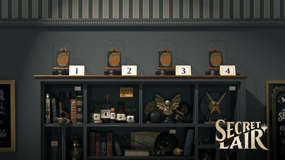 Underneath the top shelf, there are items that likely provide clues to which four cards will be included. Twitter user speculation as to the identity of these cards, based on the clues, include Scroll Rack, AEther Vial, Baleful Strix, Springleaf Drum, and others.