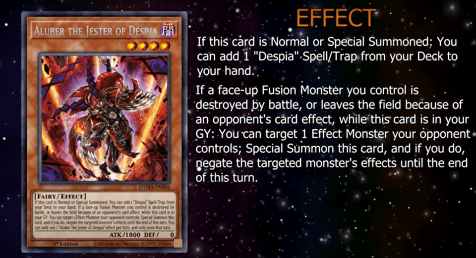 If this card is Normal or Special Summoned: You can add 1 “Despia” Spell/Trap from your Deck to your hand. If a face-up Fusion Monster you control is destroyed by battle, or leaves the field because of an opponent’s card effect, while this card is in your GY: You can target 1 Effect Monster your opponent controls; Special Summon this card, and if you do, negate the targeted monster’s effects until the end of this turn. You can only use 1 “Aluber the Jester of Despia” effect per turn and only once that turn.