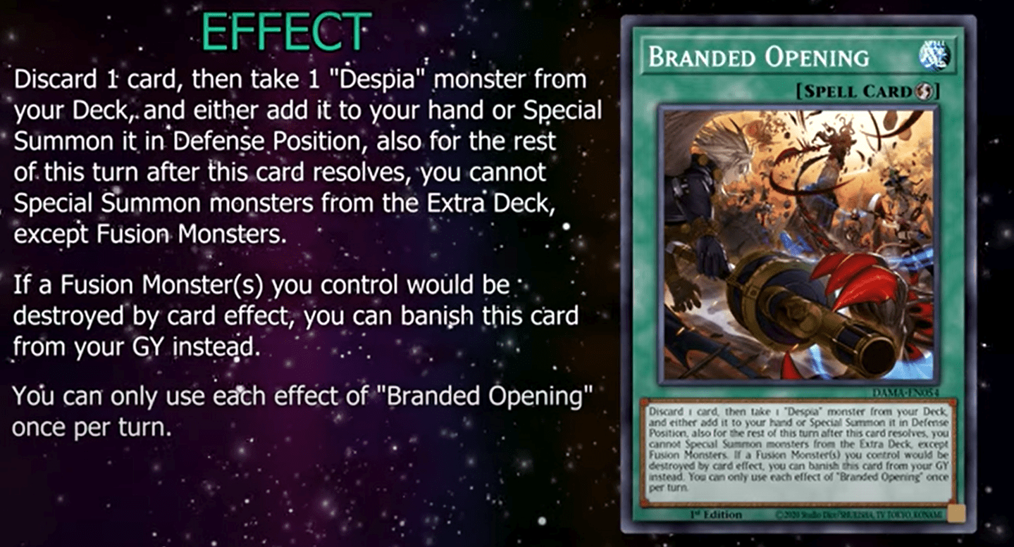 Discard 1 card, then take 1 “Despia” monster from your Deck, and either add it to your hand or Special Summon it in Defense Position, also for the rest of this turn after this card resolves, you cannot Special Summon monsters from the Extra Deck, except Fusion Monsters. If a Fusion Monster(s) you control would be destroyed by card effect, you can banish this card from your GY instead. You can only use each effect of “Branded Opening” once per turn.