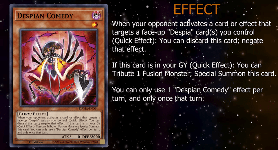 When your opponent activates a card or effect that targets a face-up “Despia” card(s) you control (Quick Effect): You can discard this card; negate that effect. If this card is in your GY (Quick Effect): You can Tribute 1 Fusion Monster; Special Summon this card. You can only use 1 “Despian Comedy” effect per turn, and only once that turn.