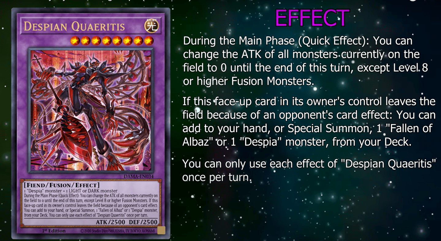 During the Main Phase (Quick Effect): You can change the ATK of all monsters currently on the field to 0 until the end of this turn, except Level 8 or higher Fusion Monsters. If this face-up card in its owner’s control leaves the field because of an opponent’s card effect: YOu can add to your hand, or Special Summon, 1 “Fallen of Albaz” or 1 “Despia” monster, from your Deck. You can only use each effect of “Despian Quaeritis” once per turn.