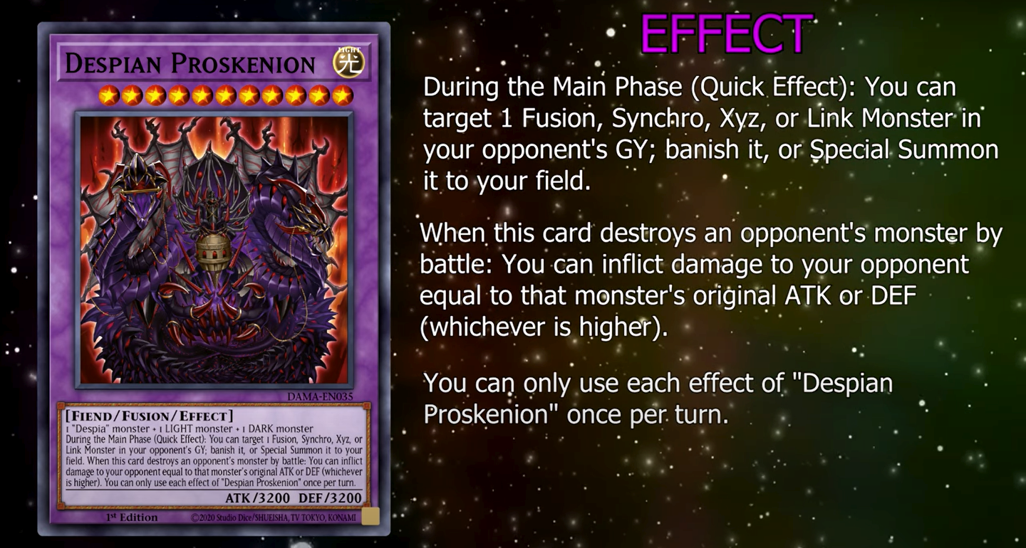 During the Main Phase (Quick Effect): You can target 1 Fusion, Synchro, Xyz or Link Monster in your opponent’s GY; banish it or Special Summon it to your field. When this card destroys an opponent’s monster by battle: You can inflict damage to your opponent equal to that monster’s original ATK or DEF (whichever is higher). You can only use each effect of “Despian Proskenion” once per turn.