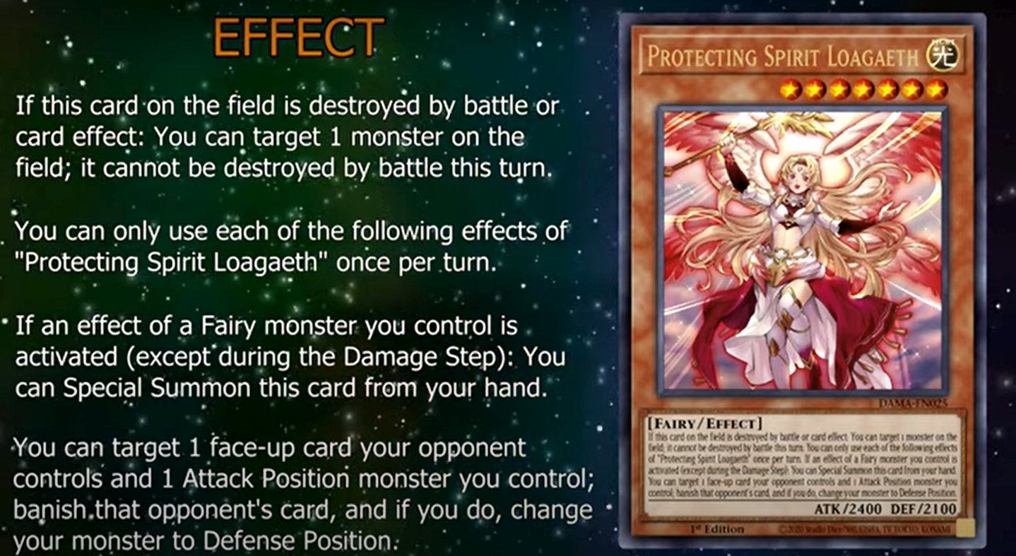 If this card on the field is destroyed by battle or card effect: You can target 1 monster on the field; it cannot be destroyed by battle this turn. You can only use each of the following effects of “Protecting Spirit Loagaeth” once per turn. If an effect of a Fairy Monster you control is activated (except during the Damage Step): You can Special Summon this card from your hand. You can target 1 face-up card your opponent controls and 1 Attack Position monster you control; banish that opponent’s card, and if you do, change your monster to Defense Position.