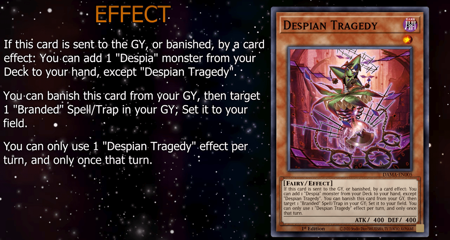 If this card is sent to the GY, or banish, by a card effect: You can add 1 “Despia” monster from your Deck to your hand, except “Despian Tragedy”. You can banish this card from your GY, then target 1 “Branded” Spell/Trap in your GY; Set it to your field. You can only use 1 “Despian Tragedy” effect per turn, and only once that turn.