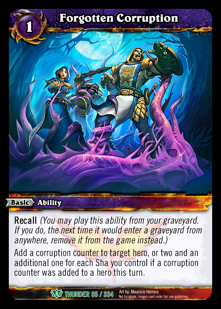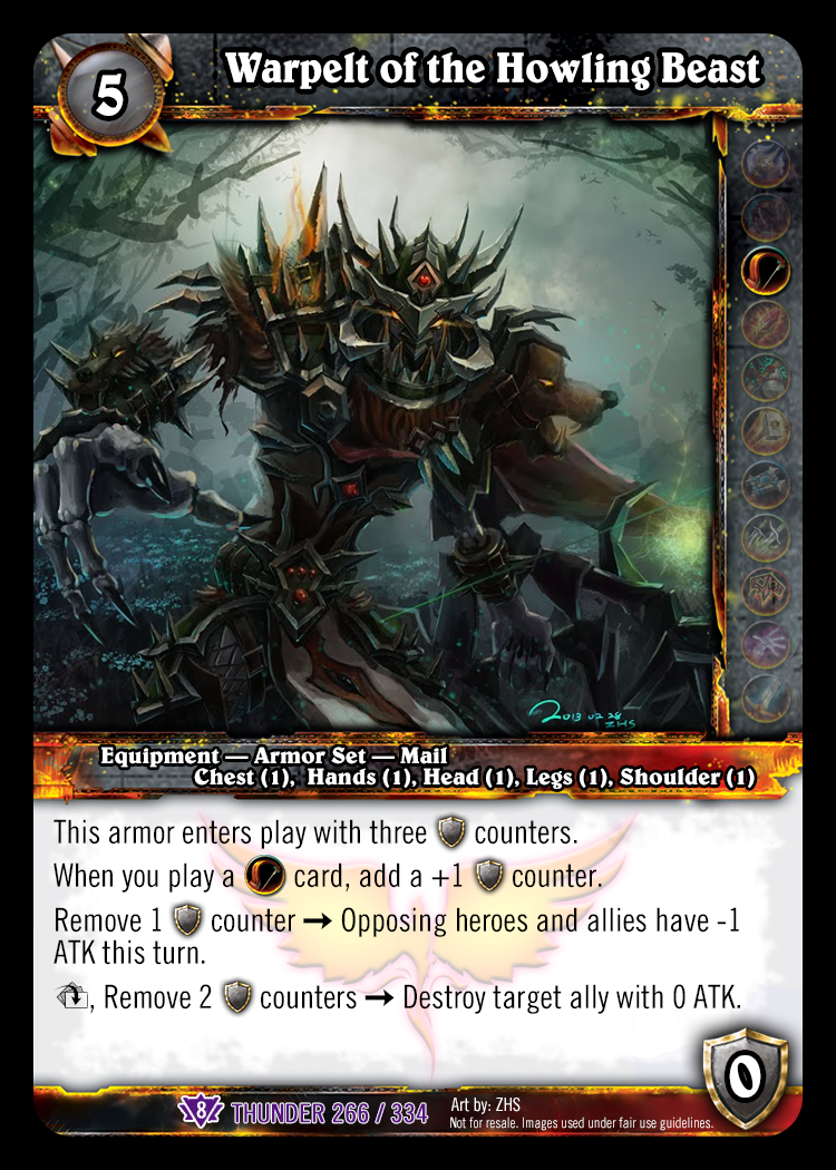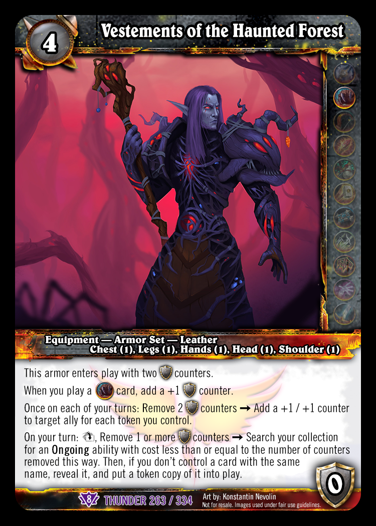Vestements of the Haunted Forest: Changed second activation power’s cost to remove at least 1 counter and added “on your turn” restriction. Now only one token of the same name can be put into play from the collection.