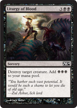 I recall that it wasn’t that long ago when Exquisite Blood was gaining some casual momentum and people were really trying to build the Exquisite Blood/Sanguine Bond combo deck. It was probably Modern legal most of the time, but not exactly a ‘thing’. Then Magic 2014 happened and they decided to reprint this: